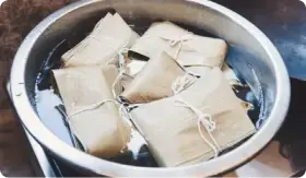 將粽葉一片片刷洗過後放入熱水裡泡軟。